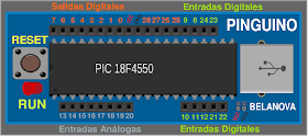 La imagen muestra como esta configurado para la tarjeta montada con el PIC18F4550, se indica cuales terminales se emplean como entradas y salidas digitales así como entradas análogas.